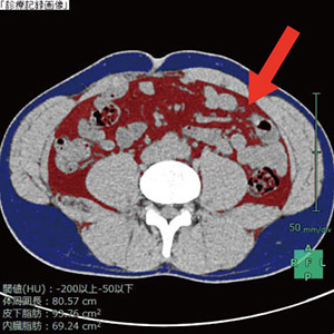 内臓脂肪面積はCTを使って測定します。やはり腹囲の測定のみでは、正確に内臓脂肪の量を測定することはできません。同時に皮下脂肪も測定するので、太っているけれど内臓脂肪型肥満ではないということもわかるかもしれません。(もちろんその逆もあります。)