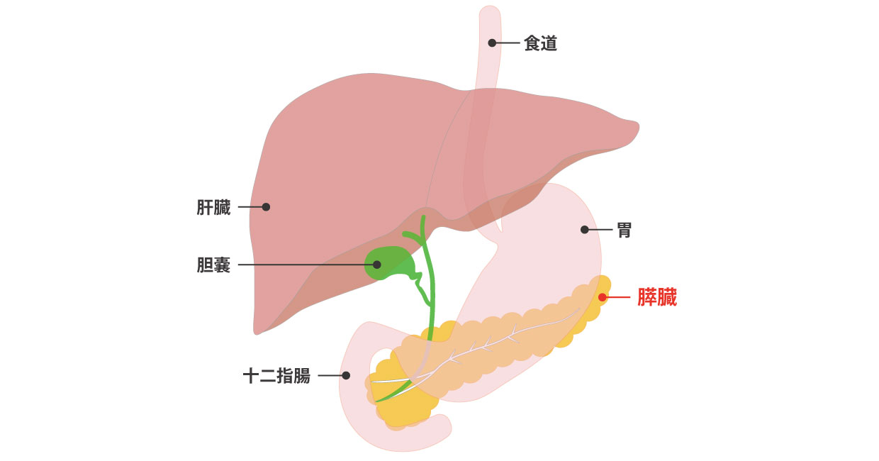 膵臓は、お腹の上の方、胃の後ろ側にある20センチメートルほどの細長い臓器です。炭水化物を分解する『アミラーゼ』やタンパク質を分解する「トリプシン」、脂肪を分解する「リパーゼ」といった消化酵素を含んだ膵液を十二指腸に分泌したり、「インスリン」や「グルカゴン」を血中に分泌して糖代謝を調節しています。