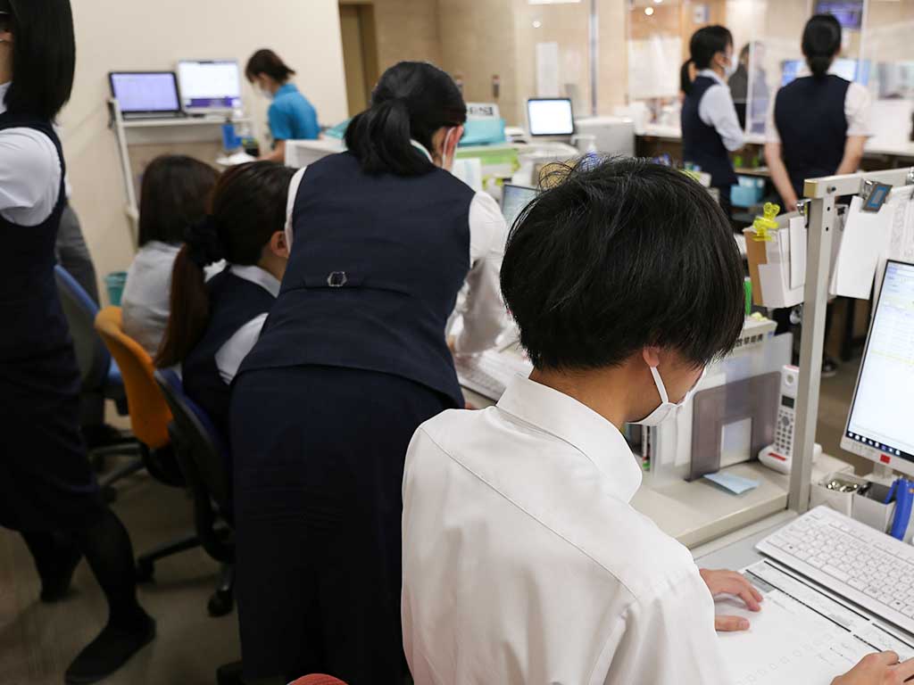 現代の医療はチーム医療。医師をはじめ、看護師や医療技術職員が力を合わせて患者さんの治療にあたります。事務職員も患者さんが安心して治療が受けられるよう、医療費に関する相談や医療材料の取り扱い、その他スタッフが円滑なコミュニケーションが行えるよう、様々な面でチーム医療をサポートします。